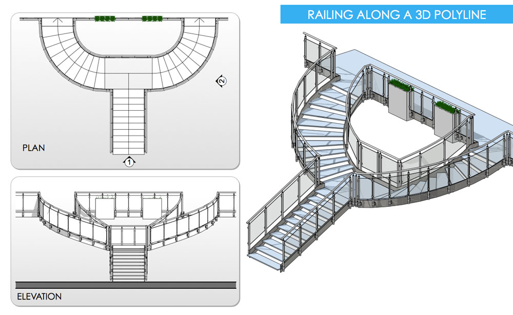 3DMD Railings are archicad object tools. You can simple draw a 3d polyline both 2d and 3d window. You can create curved and sloped path. There are many parameters for post, panel, cable, handrail; you can create you own rail. An option for list allow you to have the railing straightened in the schedule also with quantities for each elements of the railing. You can quickly manage in 2d/3d windows the position and visibility of posts and cables/panels.