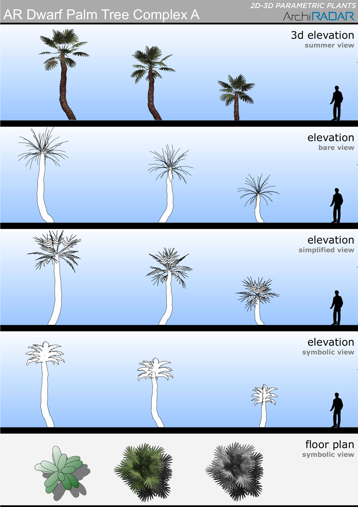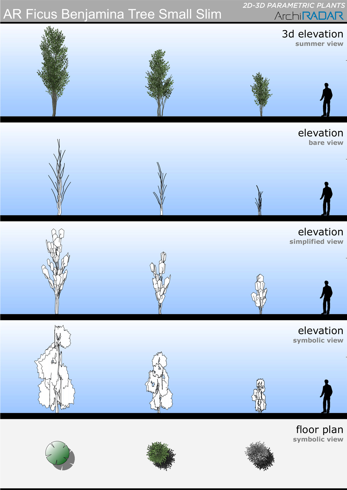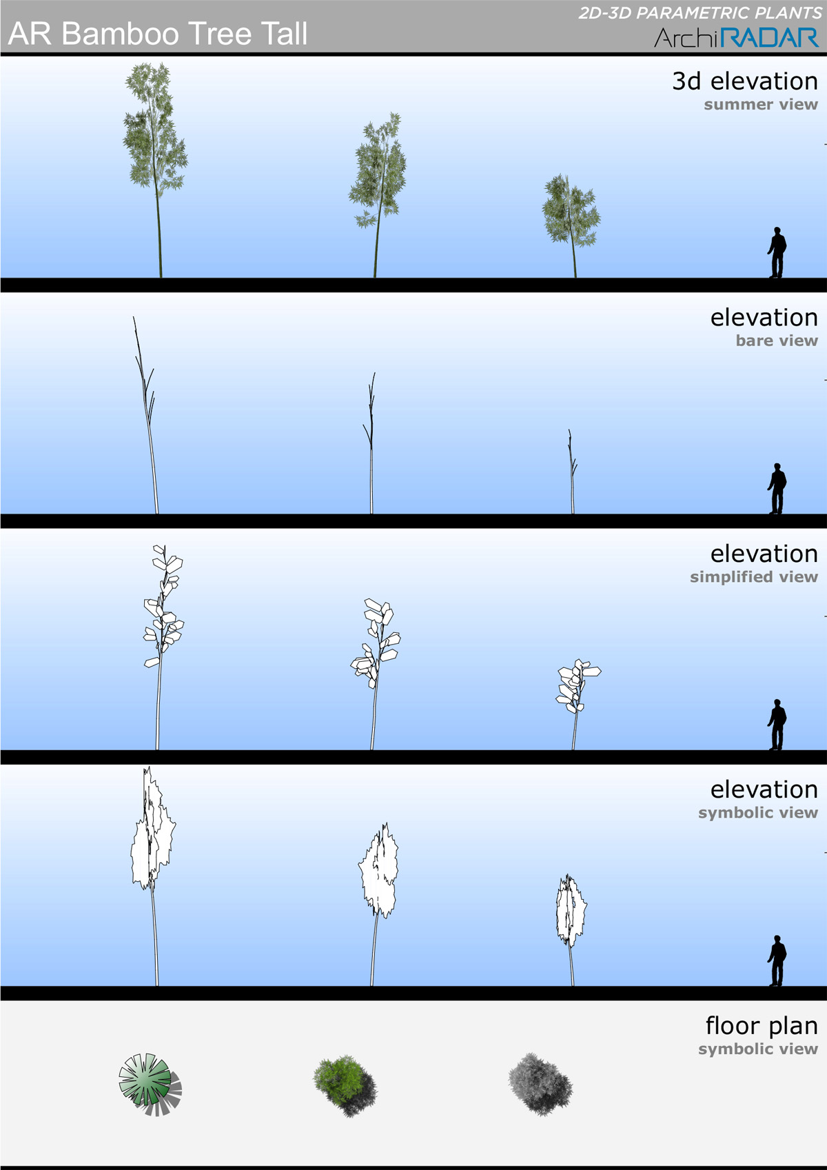 The objects are made with a low polygon quantity, they have a real growing factor according to the size and a corresponding symbolic view in elevation. Optimized for BIMX.