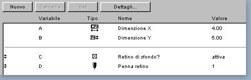 Questa riga verrà visualizzata anche nella finestra settaggi oggetto. Il testo descrittivo, che spiega all'utente il significato del parametro, deve essere digitato nella colonna Nome.  Noi scriveremo "Retino di sfondo?". Il valore di questo parametro va ovviamente inserito nel campo Valore, ma questo campo è predisposto per l'inserimento di una misura... che fare? È sufficiente cambiare il Tipo parametro, agendo sul menu a comparsa, a destra della lettera C. Noi abbiamo bisogno di un valore tipo "ON/OFF", una casella di scelta, che in gergo si chiama "Valore Booleano".