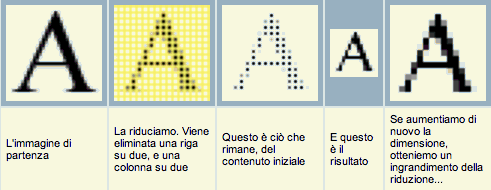 Per spiegarsi meglio: Se abbiamo un'immagine di 800x600 punti e la riduciamo a 400x300, avremo eliminato i tre quarti delle informazioni. Portando questa nuova immagine alle dimensioni di quella di partenza, il software aggiungerà il 300% di informazioni, basandosi sui (400x300) 120.000 punti attuali, creandone altri 360.000 nuovi di zecca. In genere, l'effetto che si ottiene è quello di una sfocatura più o meno pronunciata (ovviamente dipende anche dal contenuto dell'immagine). Anche il processo inverso porta ad un degrado del contenuto. Ridurre un'immagine dopo averla ingrandita produce un risultato meno sgradevole, ma ovviamente non si tornerà mai alla qualità originaria perché, quasi certamente, non verranno eliminati tutti e solo i punti aggiunti. Soprattutto perché la maggior parte dei programmi non si limita ad "aggiungere" e "togliere" punti, ma modifica leggermente anche tutti gli altri, per migliorare l'effetto finale.