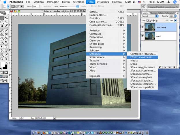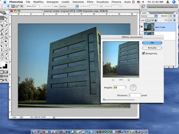 Adesso ci divertiamo con i filtri: il filtro Sfocatura di Photoshop è semplicemente fantastico, ma usatelo con intelligenza perchè può facilmente rovinare l'immagine. Per impostare l'effetto di una mano che leggermente si muove impugnando una macchina fotografica usate il filtro Effetto movimento. Ci sono molti modi per usarlo e lo vedremo in dettaglio nei prossimi tutorial; per adesso limitatevi ad usarlo come mostrato nell'esempio.